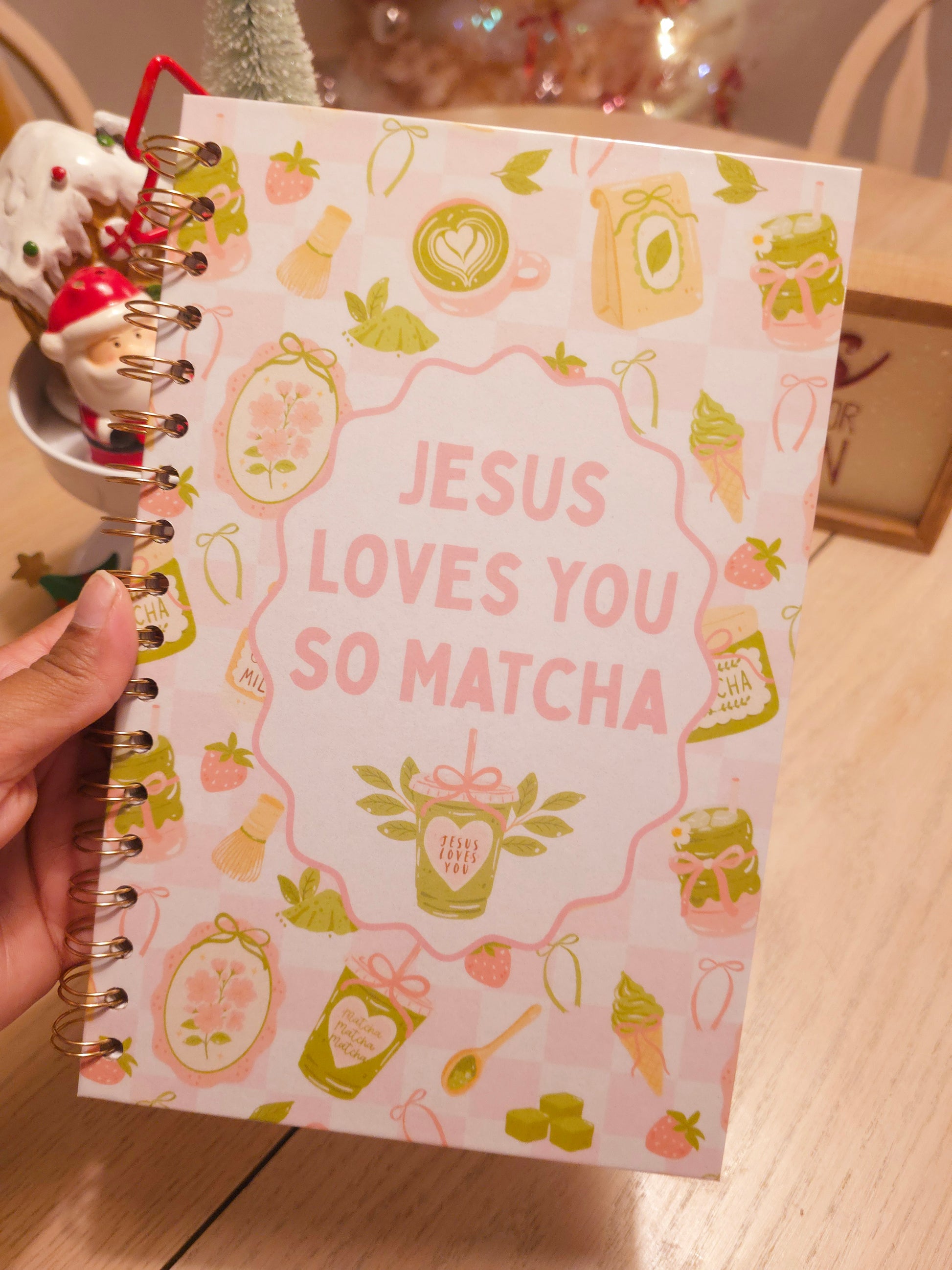 Beautiful Jesus loves you so matcha notebook! Perfect for journaling, note-taking, or writing letters to Jesus. Handmade with love & detail, it's a special companion for quiet moments with God.