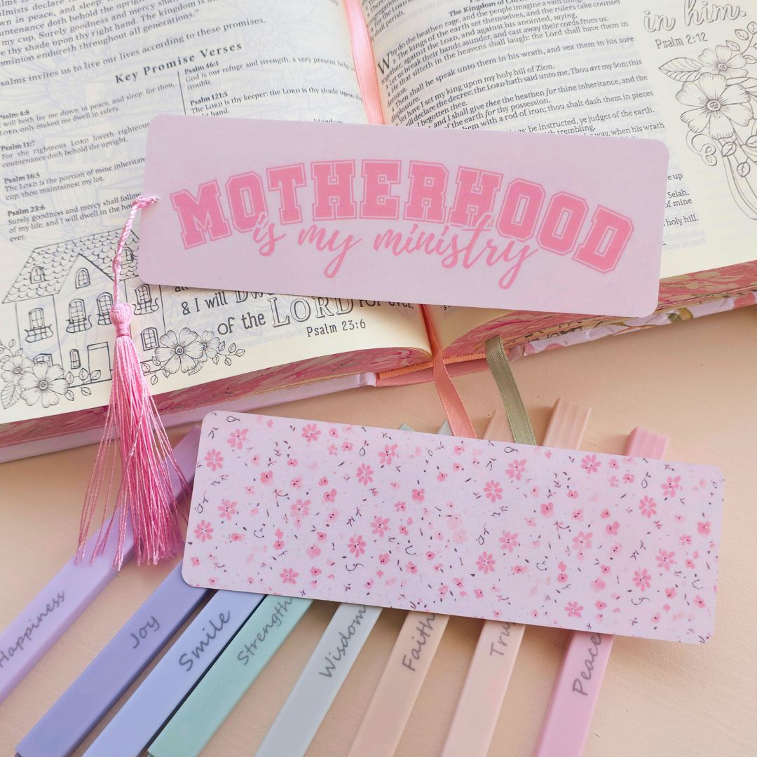 Handmade with love, these MotherHood is my ministry bookmarks are printed on cardstock, feature a double-sided design, and are laminated for durability.