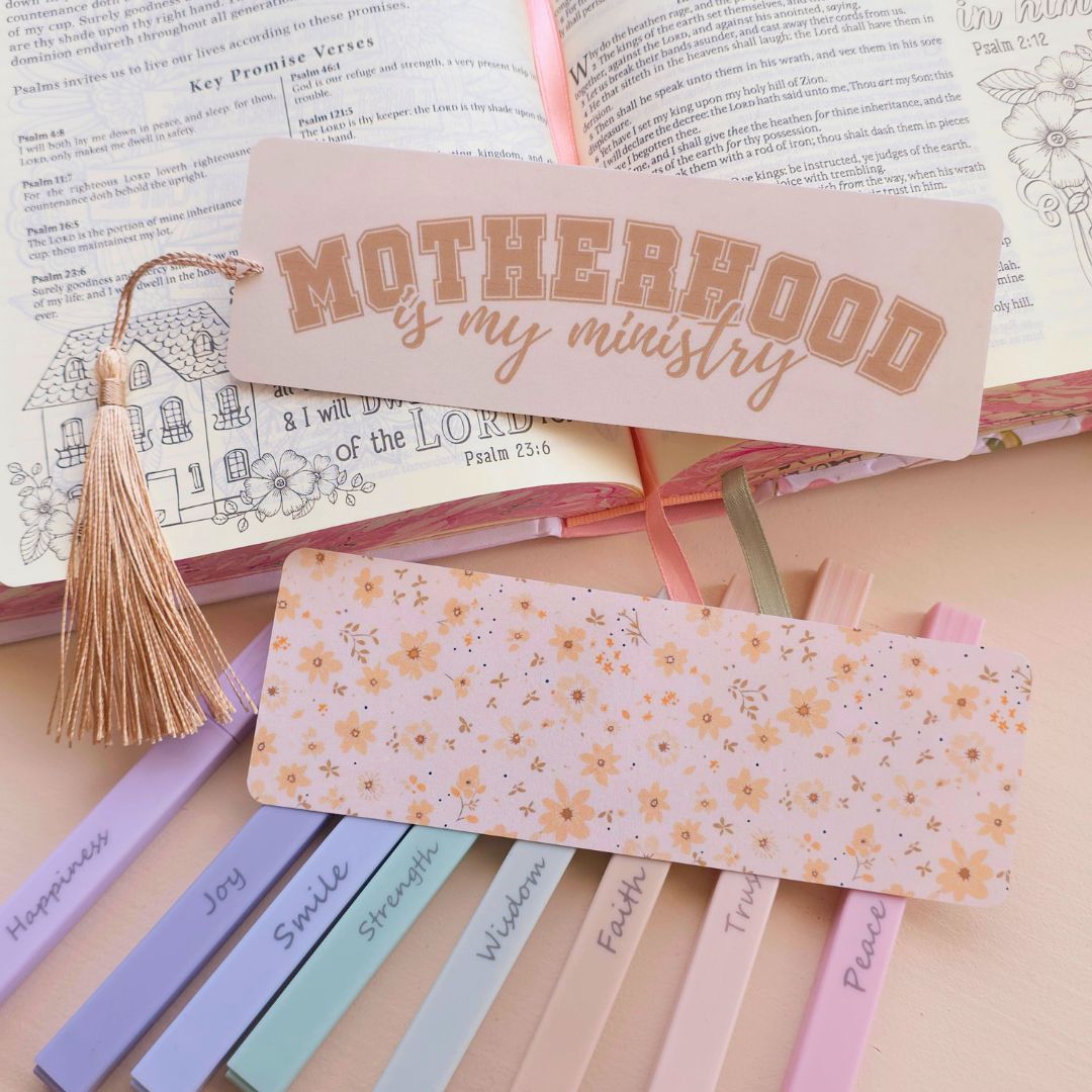 Handmade with love, these MotherHood is my ministry bookmarks are printed on cardstock, feature a double-sided design, and are laminated for durability.