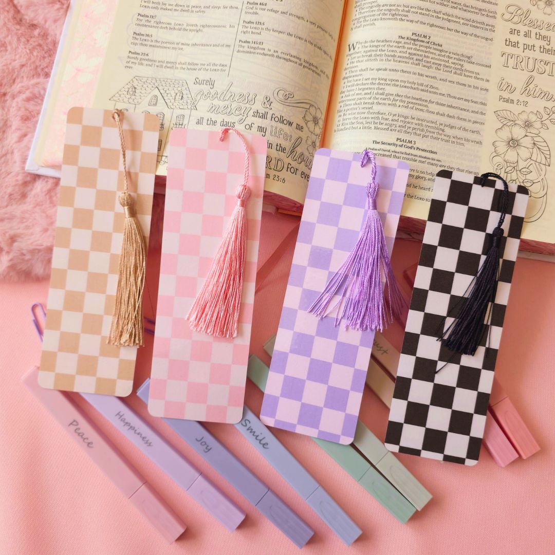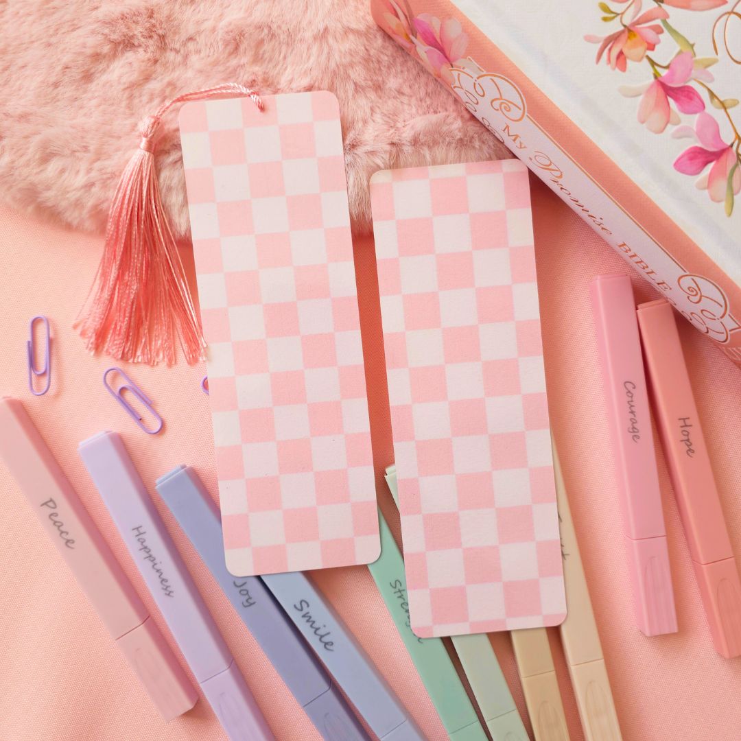 Handcrafted with love, these checker print bookmarks are sturdy, double-sided, and laminated.