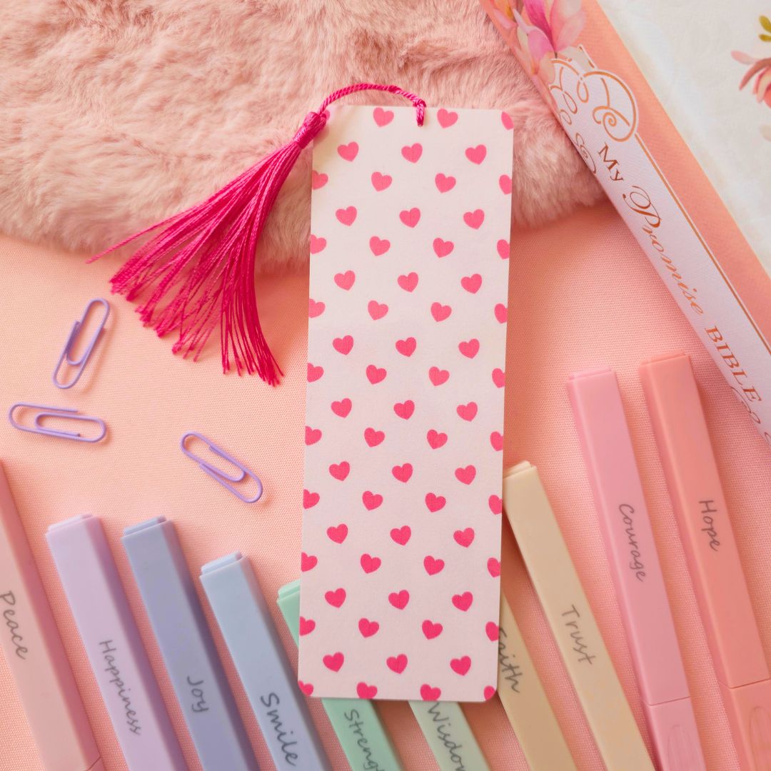 Adorably crafted with affection, these Pink Hearts bookmarks are made of sturdy cardstock, showcasing a dual-sided layout and coated for long-lasting quality.