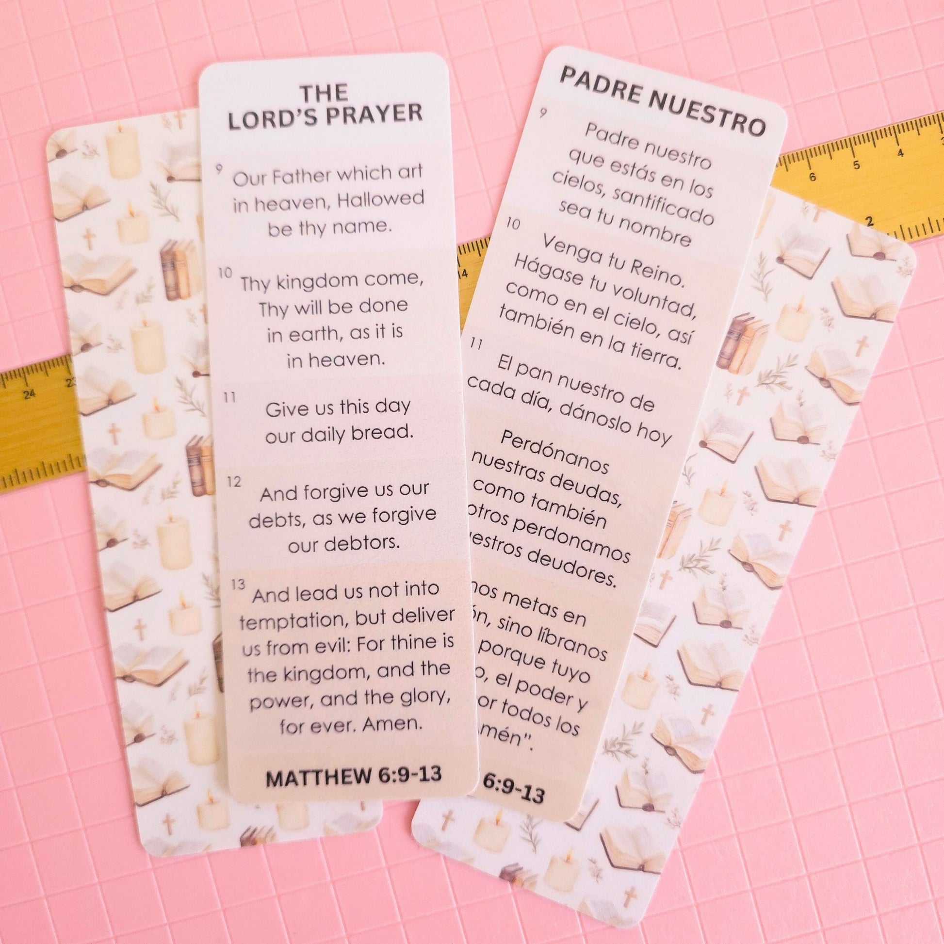 Handmade with love, The Lord's Prayer bookmarks are printed on cardstock, feature a double-sided design, and are laminated for durability.