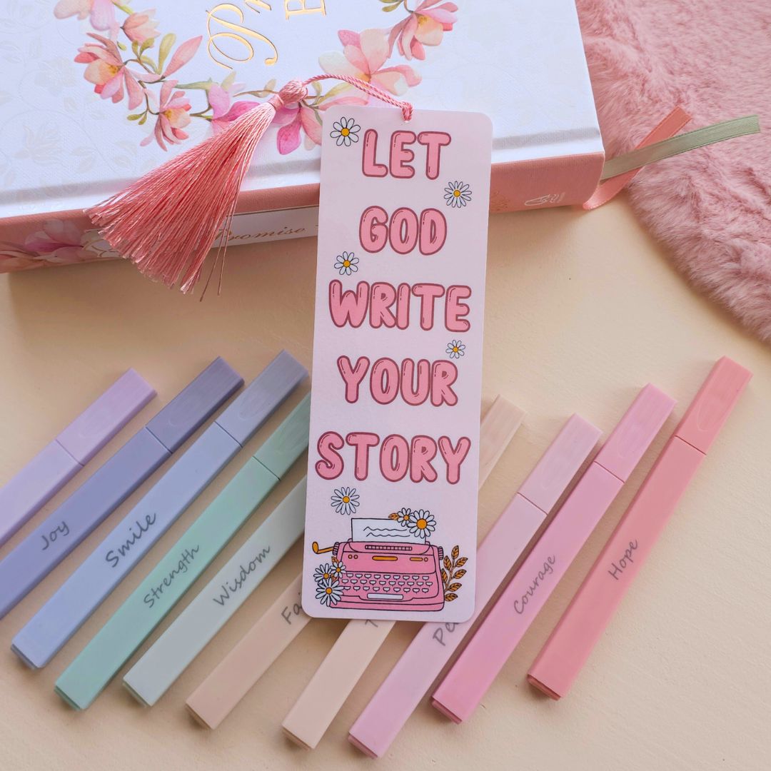 Handmade with love, let God write your story bookmarks are printed on cardstock, feature a double-sided design, and are laminated for durability.